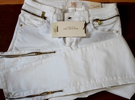 White Top from Mango, Waxed White Skinny Trousers from Zara, Black Leather Slip ons from Dune
