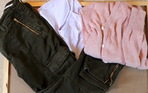 CARGO Trousers with Zips from Zara, Lilac top from Zara and Pink cardigan from MUJI. Fabulous cargo style trousers, the colour and the zips caught my eye.