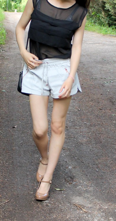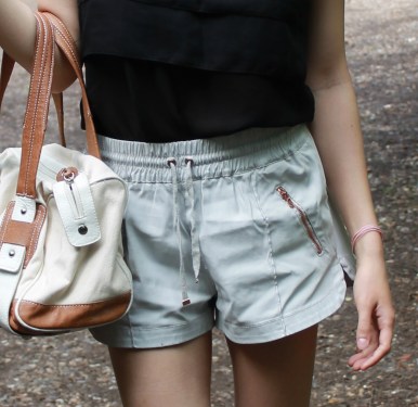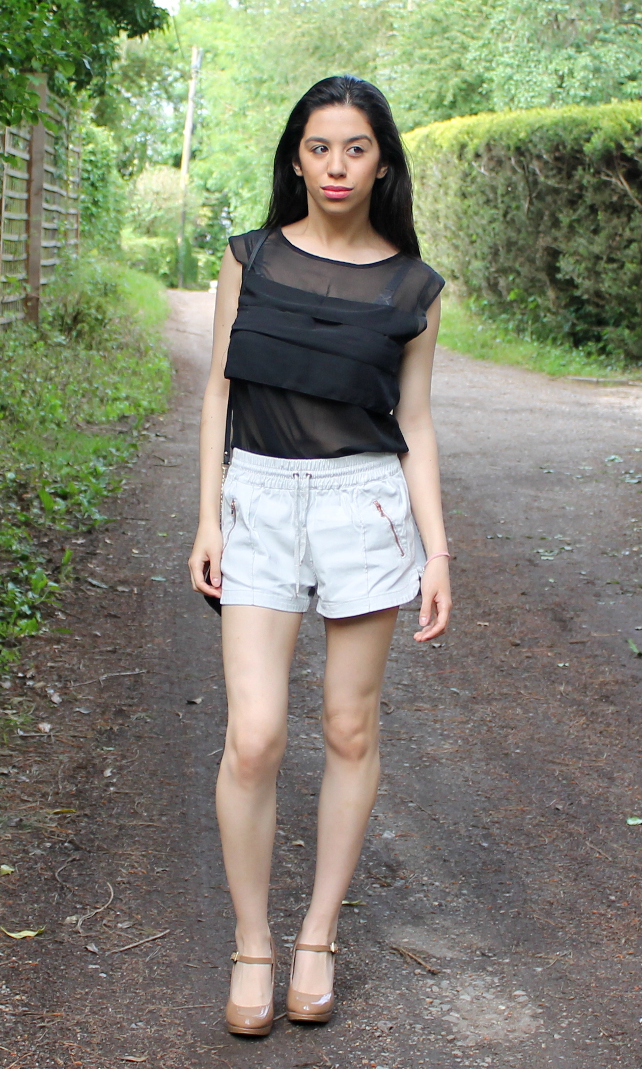 Top from Primark, shorts from Zara, Mocha heels from Debenhams, Black bag from Dorothy Perkins, Creme Bag from Laura Ashley.