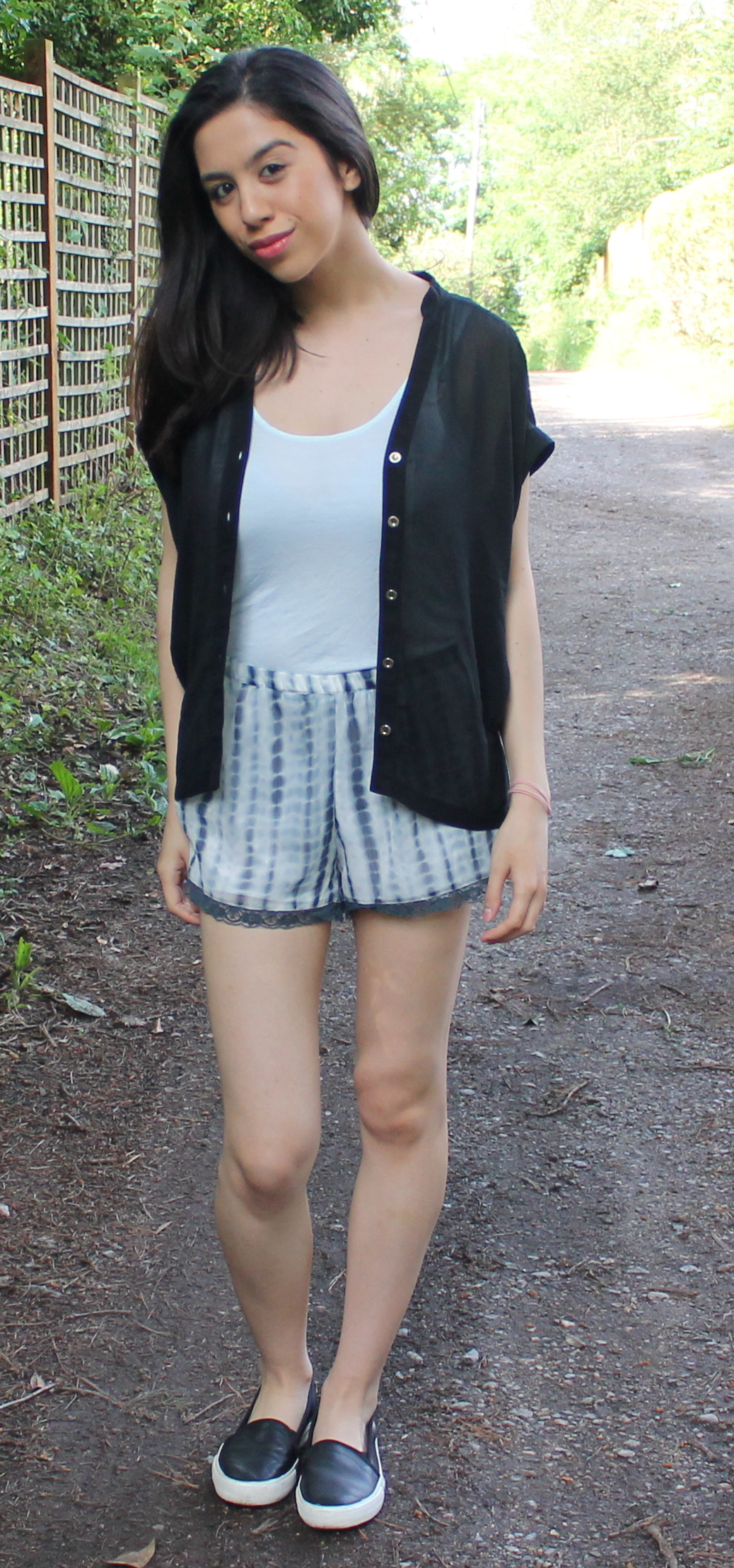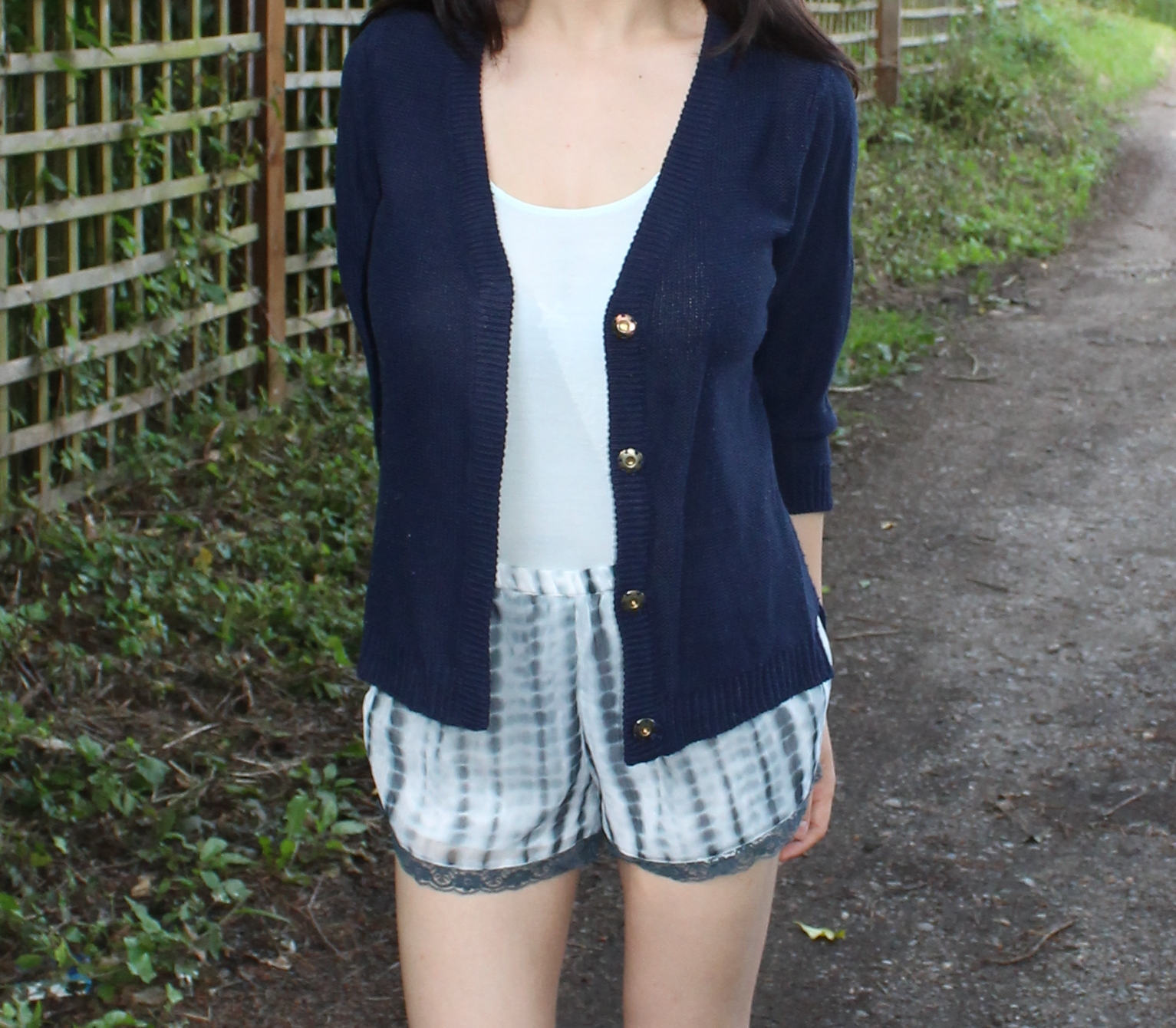 Shorts from Zara, plain turquoise top free from Elle magazine, black shirt from Topshop, blue cardigan from Zara, shoes from Dune.