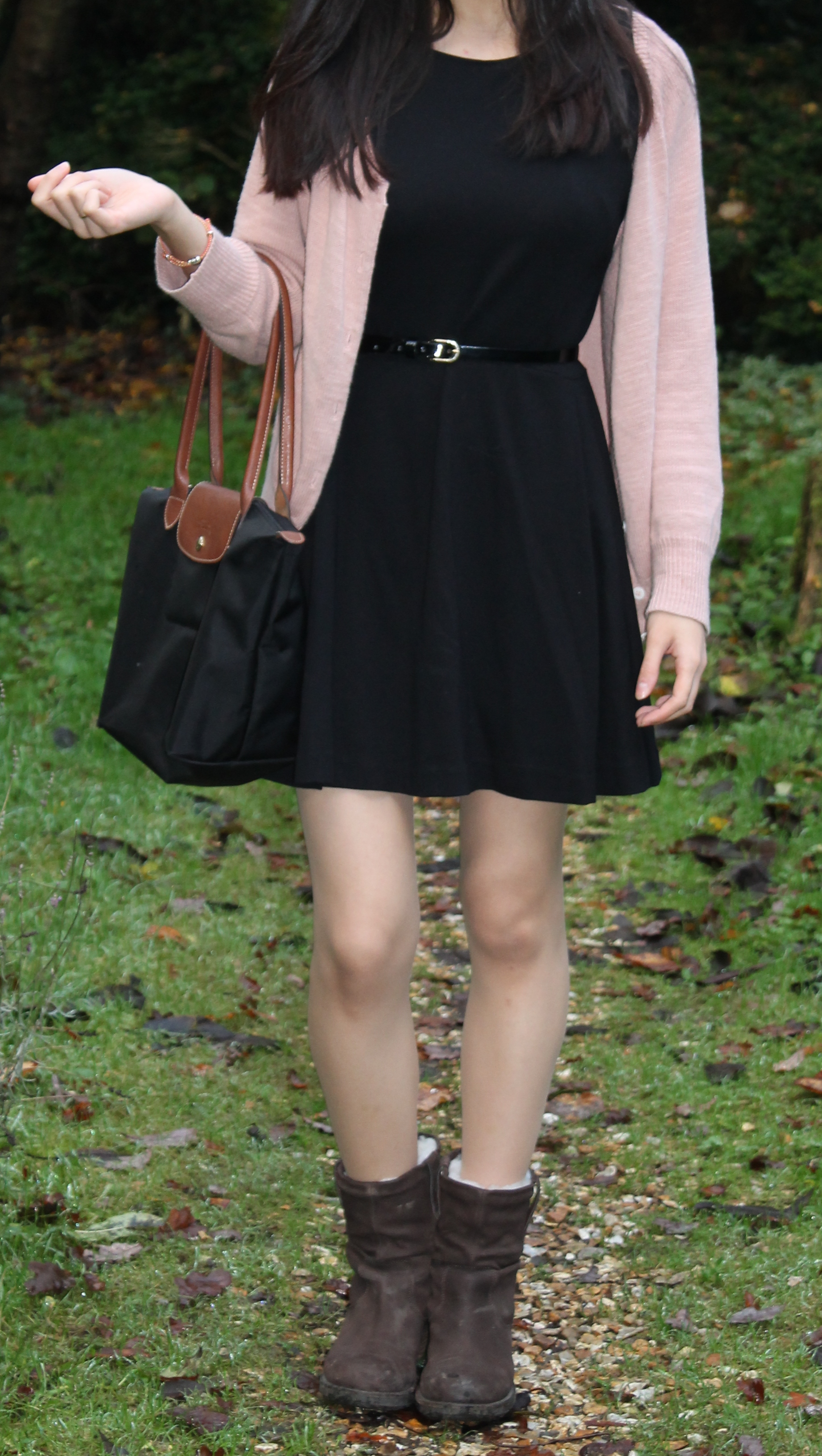 The boots tone the outfit down/ help prevent my toes going numb- they’re warm and fluffy on the inside- but black heels would work for a less casual look.