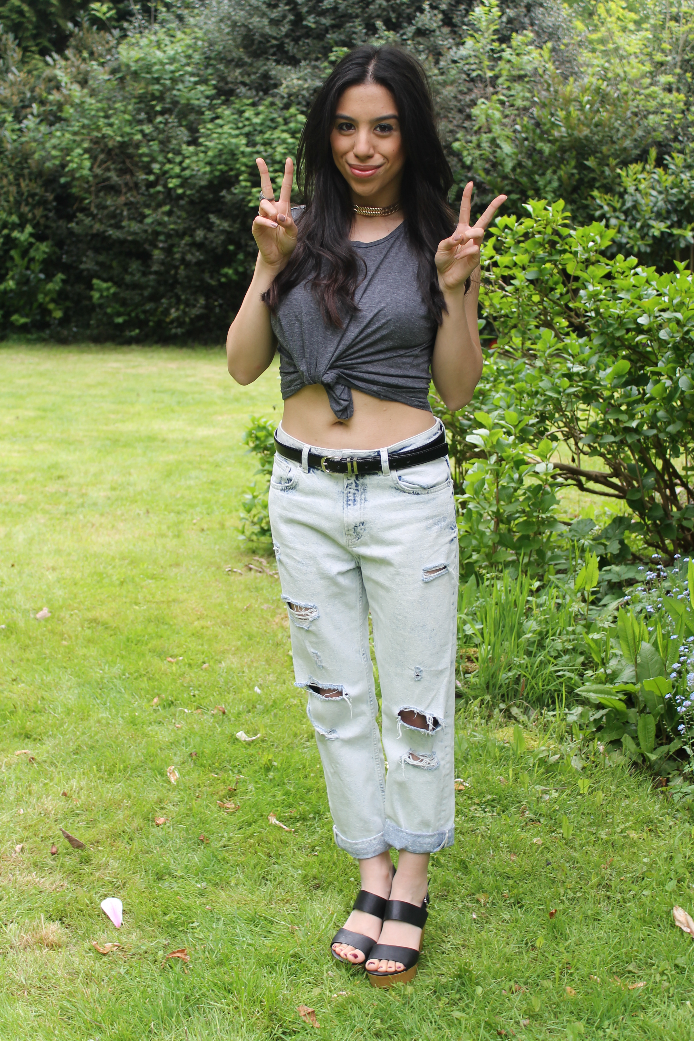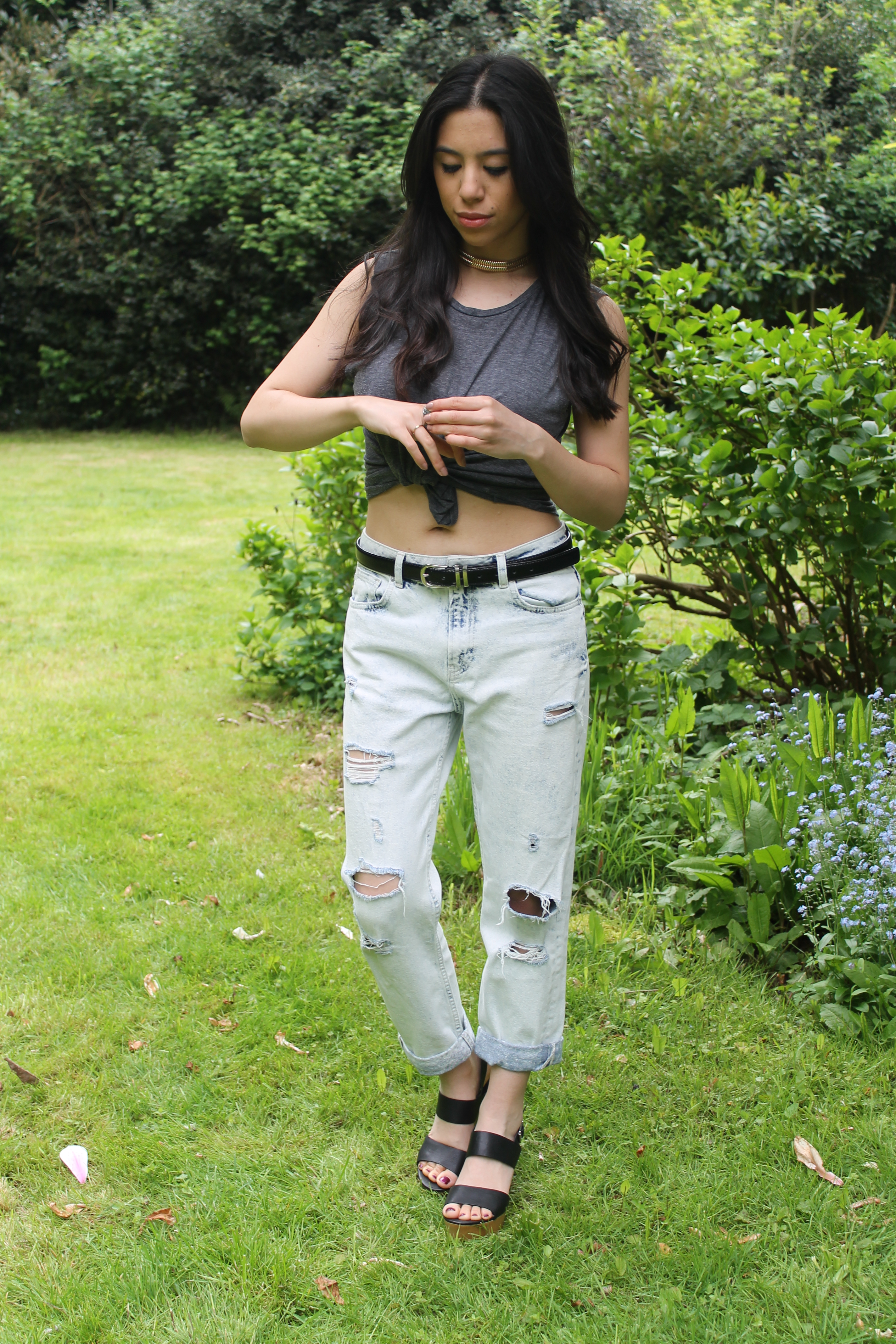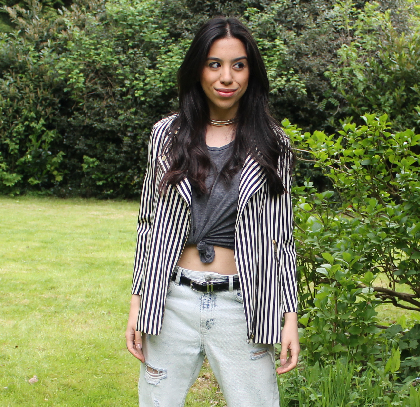 Look #58: Grey Top and Choker – Topshop, Ripped Jeans and Striped Jacket – Zara, Shoes – New Look