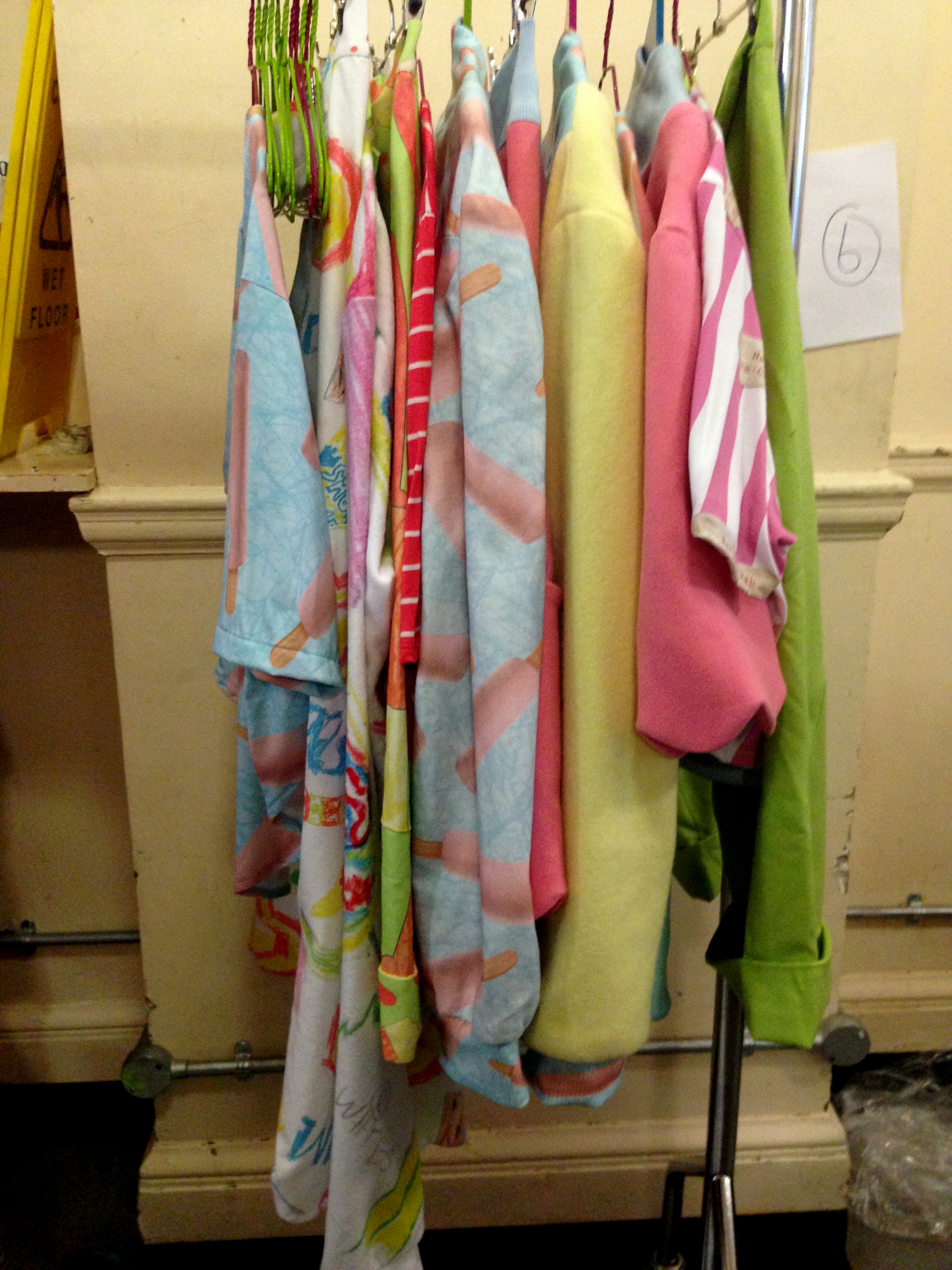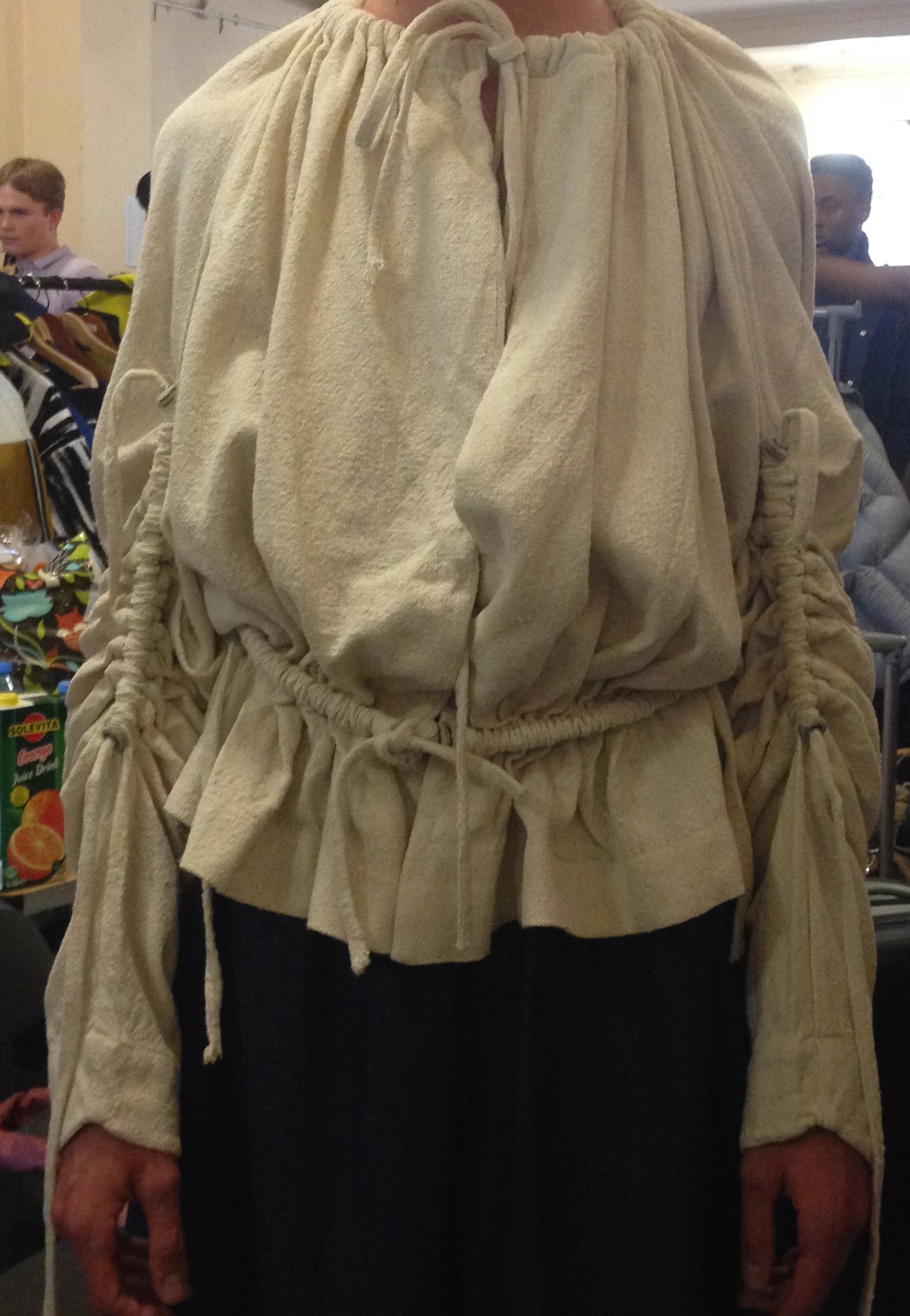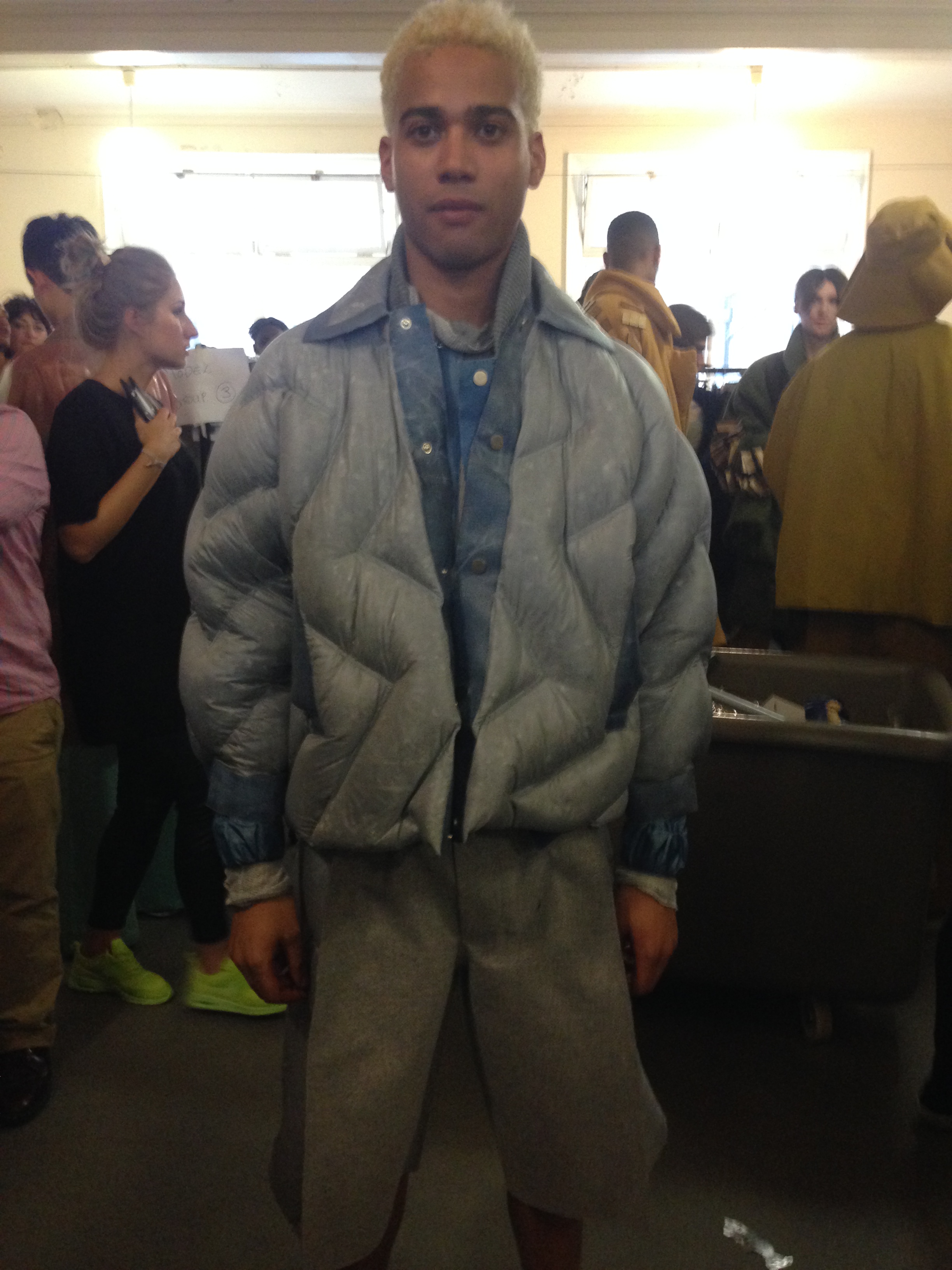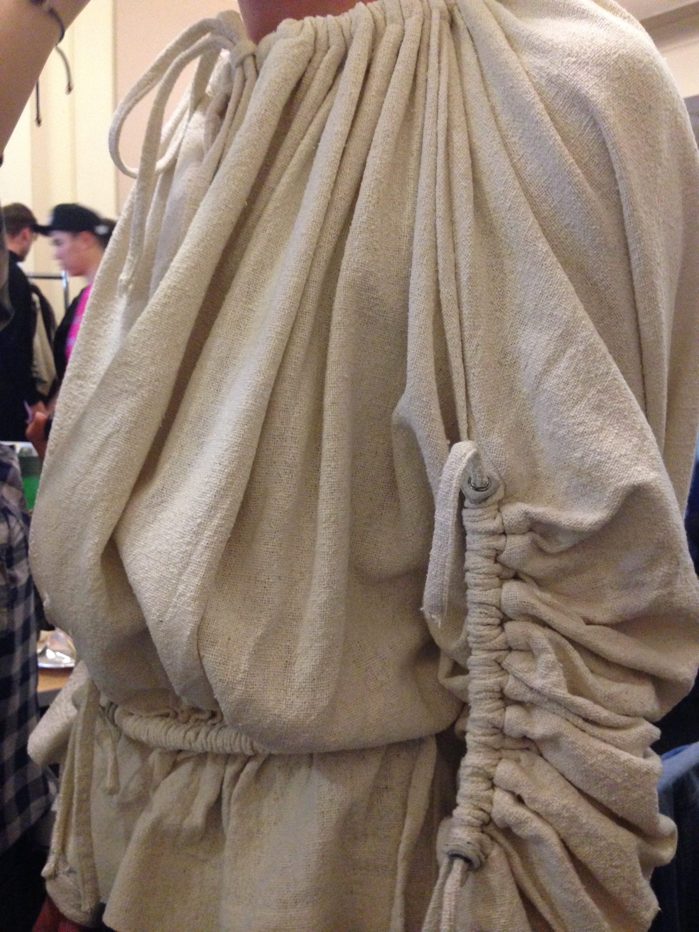 Liz leads me to one very crowded –and rather stuffy- room, where I find twenty-six graduates, a handful of models, photographers, makeup artists and others present simply for moral support. Everyone is busy in preparation and within minutes I’m discussing polyurethane and sustainability with one designer, then organza and herringbone wool with the next. Some got very technical.