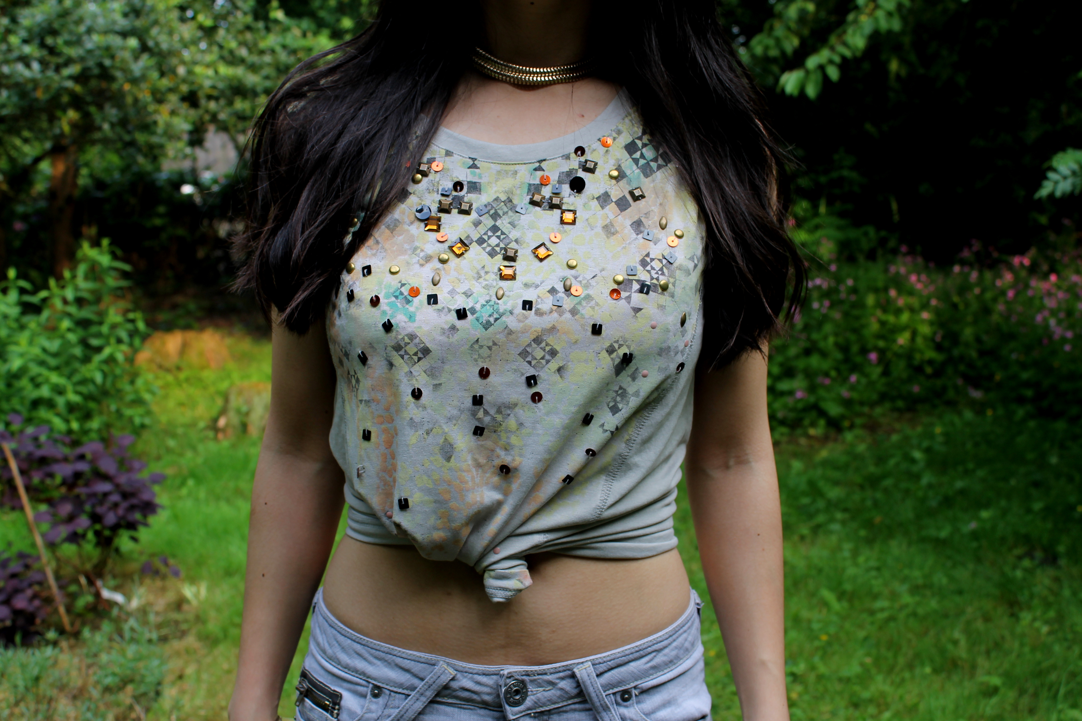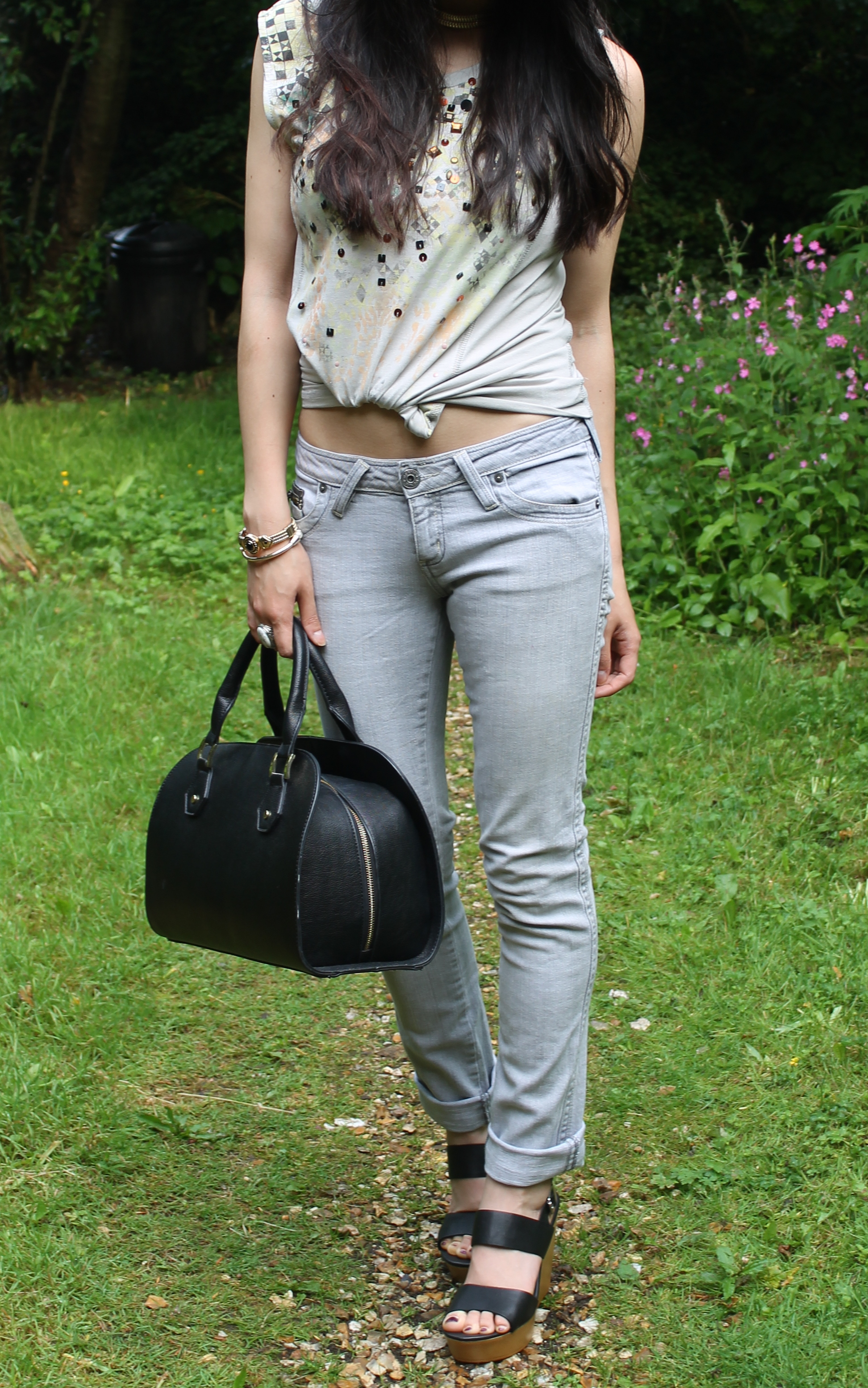 This weekend I was too hot and bothered to attempt anything visually exciting. I wouldn’t even call this one an outfit; it’s grey on grey with a hint of gold and a splatter of sequins. (One of which I found in my Spaghetti Bolognese that night…*ahem* inadequate stitching…*)