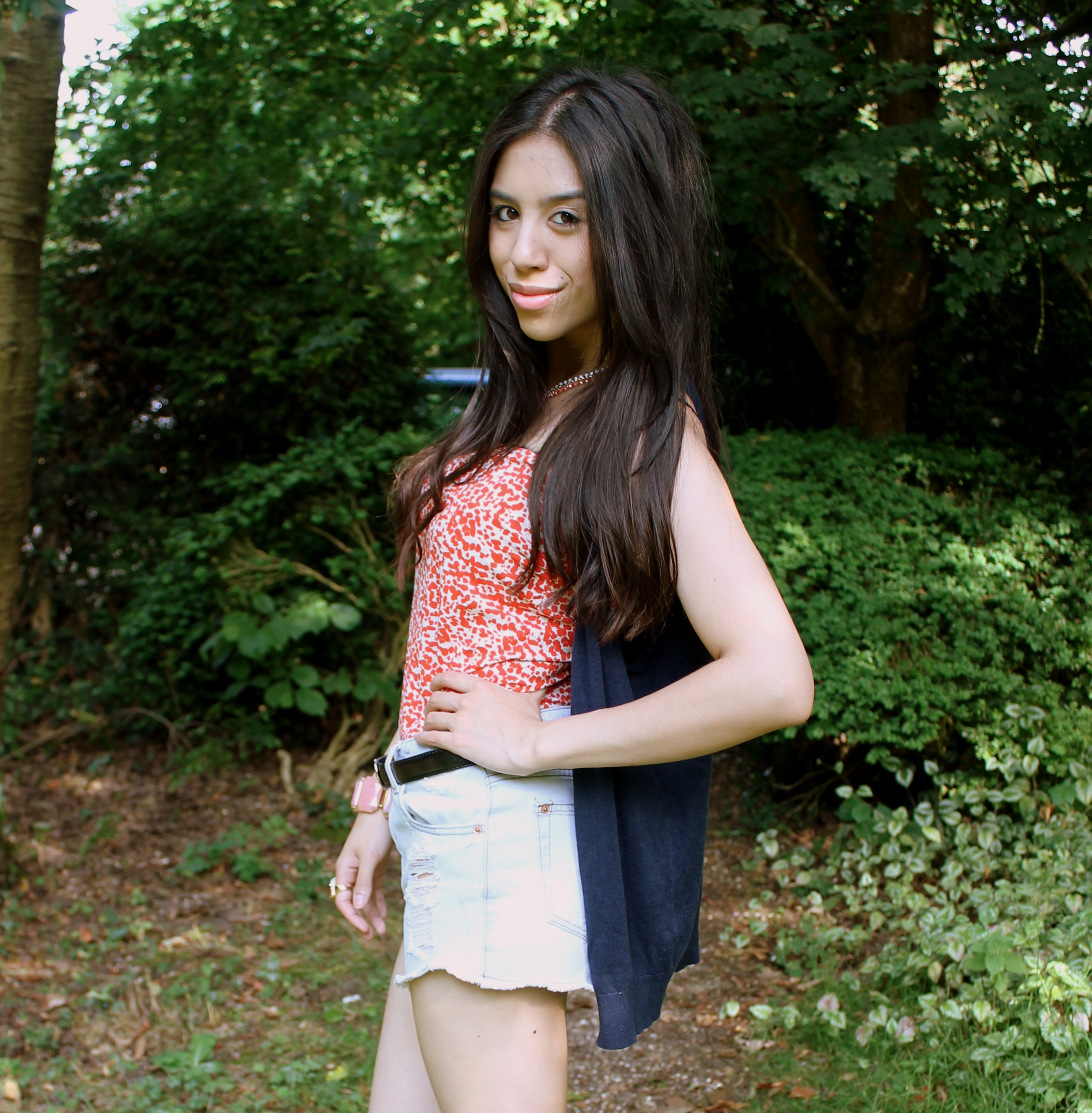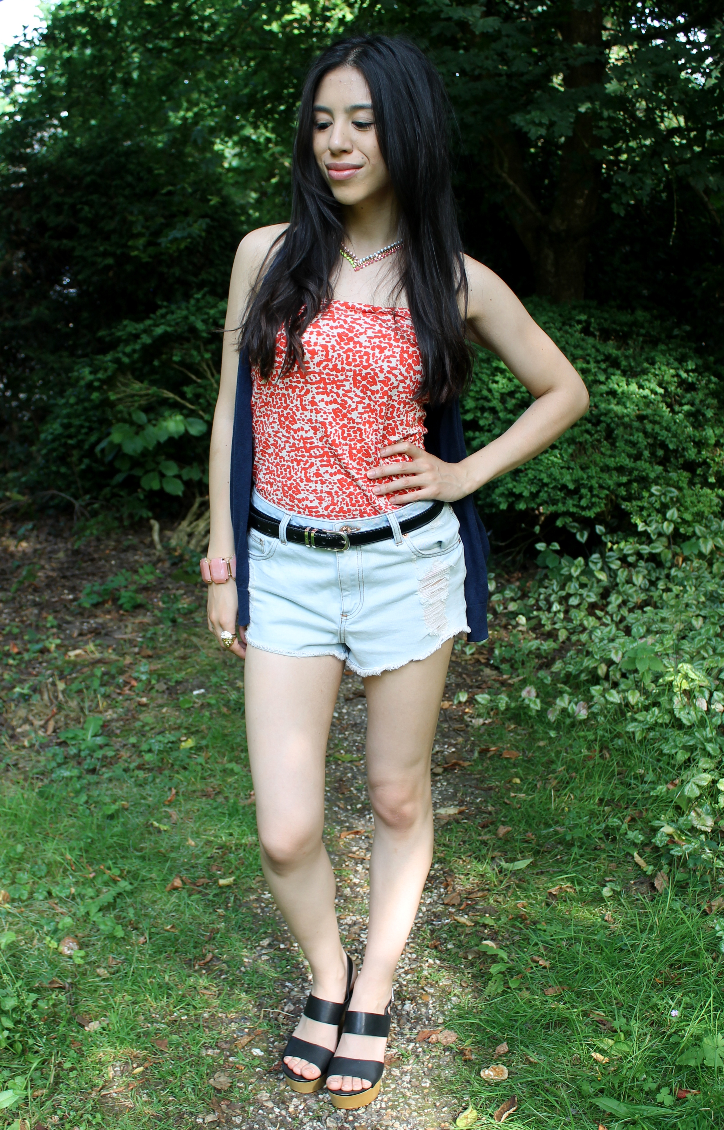 Look #68: Orange Boob Tube – H&M, Shorts – Miss Selfridge, Blue Sweatshirt and Blue cardi – Topshop, Shoes – New Look, Chunky Bracelet – Forever 21, Necklace – Dorothy Perkins.