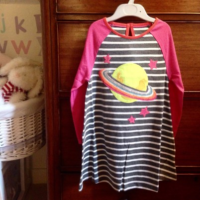 The gorgeous dress our dear neighbour Riki bought for Maia from Boden. Every Birthday Riki lets me choose something from Boden to buy for Maia. I went for a space theme this year…