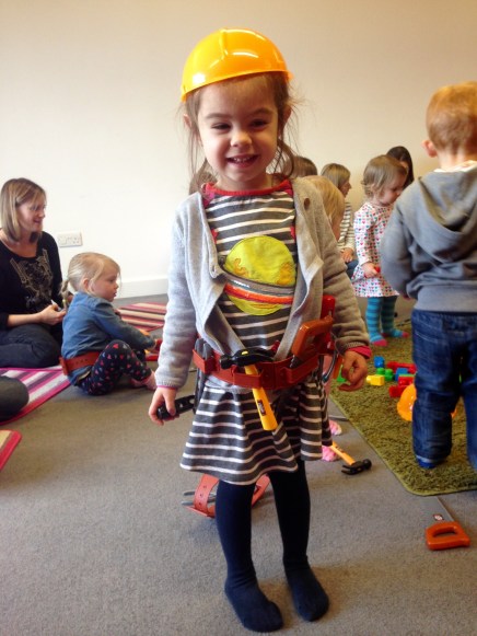 This week they were construction workers. Maia loved it but wasn’t so happy when I had to take away her plastic screwdriver because she was running around the room trying to pop bubbles with it, and I was afraid she might poke a baby’s eye out. Yes it’s plastic, but in the hands of a three year old it’s still a tiny weapon.