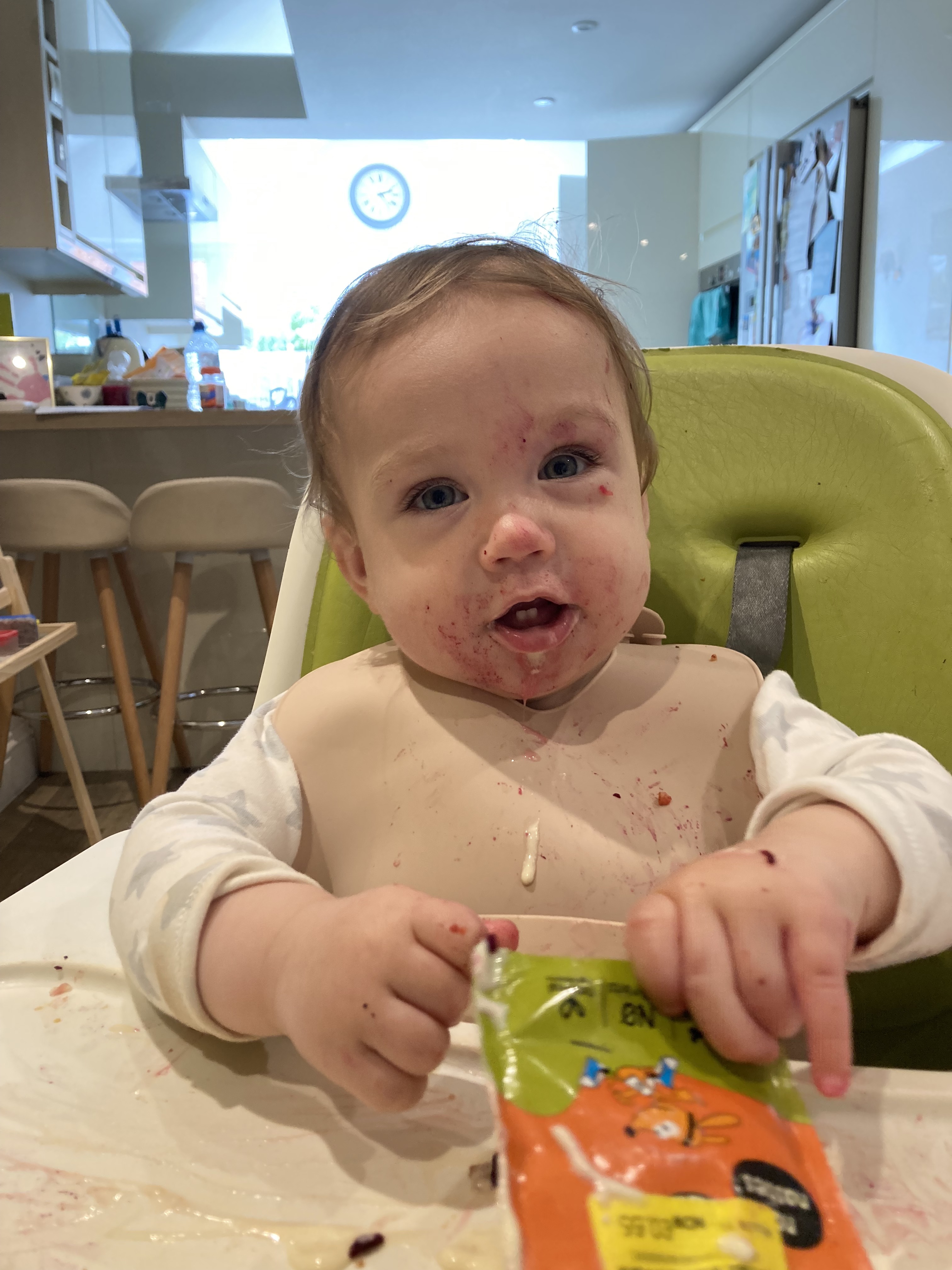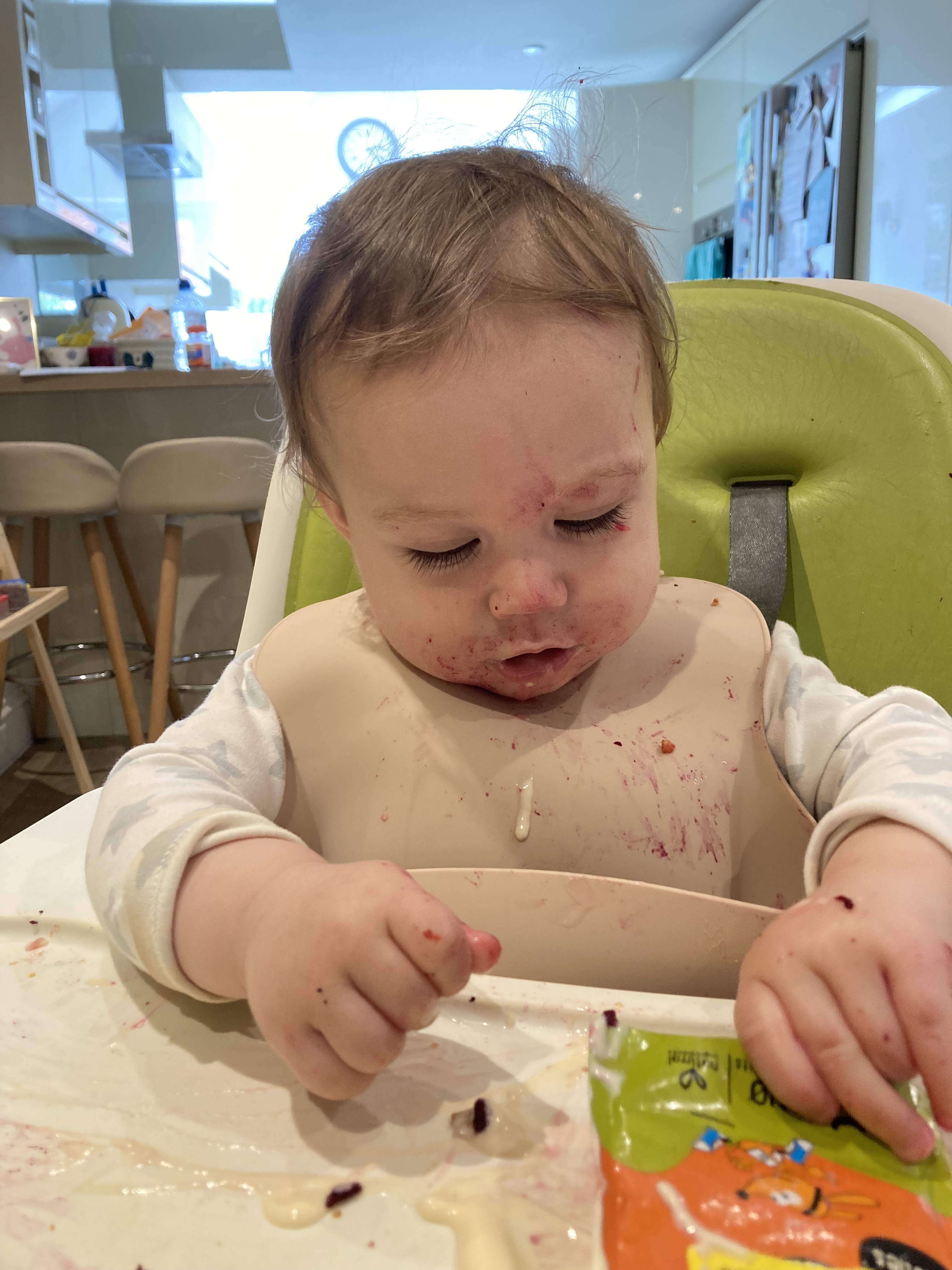 Some days we’ll leave the house and it’ll look like I didn’t clean his face, because there’s a stubborn bit of dried whatever stuck in his eyebrow. (If it’s REALLY bad (so most days) I’ll hose him down in the shower post-meal).