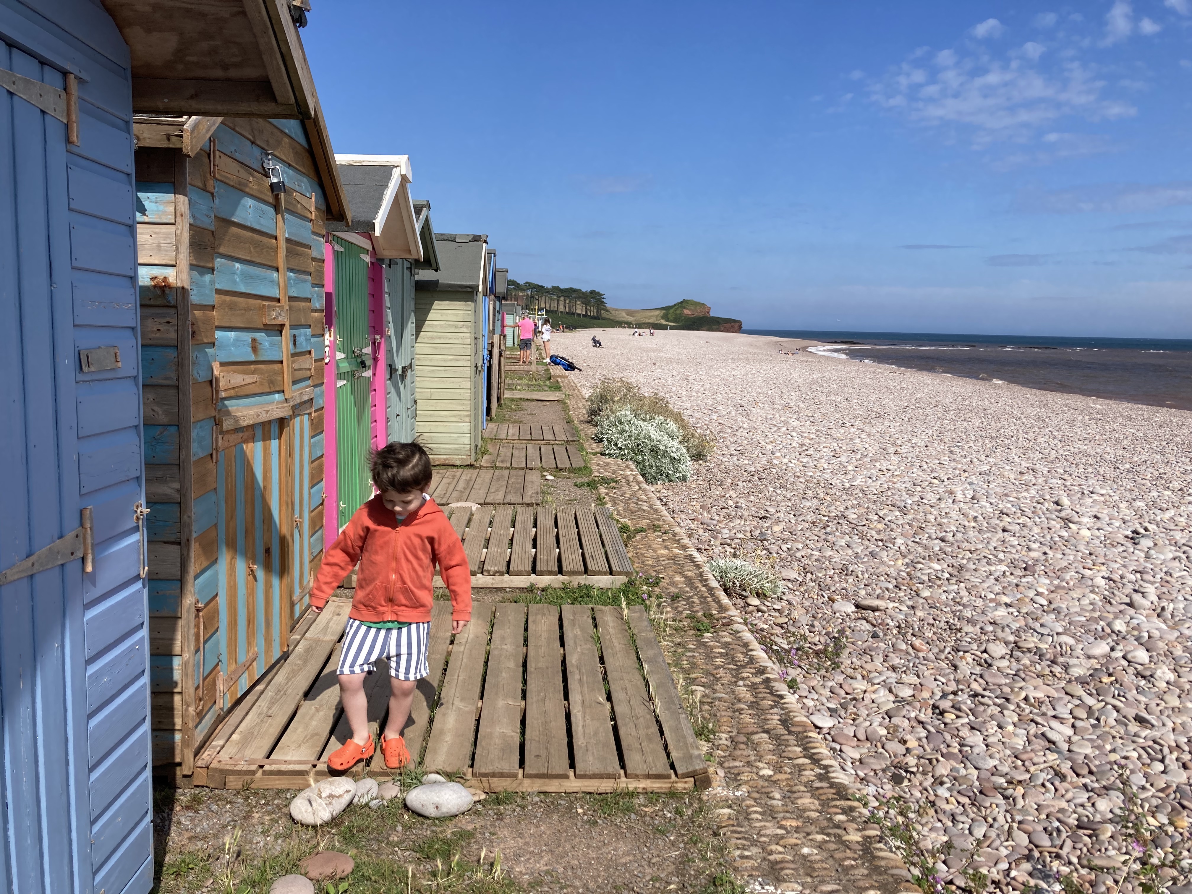 Day one involved trips to both Budleigh Salterton and Sidmouth, where we noticed, in both places, the water was not the most appealing of colours. Distinctly brown, fading into a more typical dark blue further into the sea. Google assured us it was “a common marine algae found in UK coastal waters..which is often mistaken for sewage”, but understandably Maia was a tad put off by my Googling and the mention of the word “sewage”, so remained on dry land. She was not thrilled by this. After ice-cream, hide and seek amongst the colourful beach huts, a park visit and a second round of fish and chips, it was, despite the murky waters; a lovely day. Both towns were particularly charming with their beautiful coastal views and seaside shops.